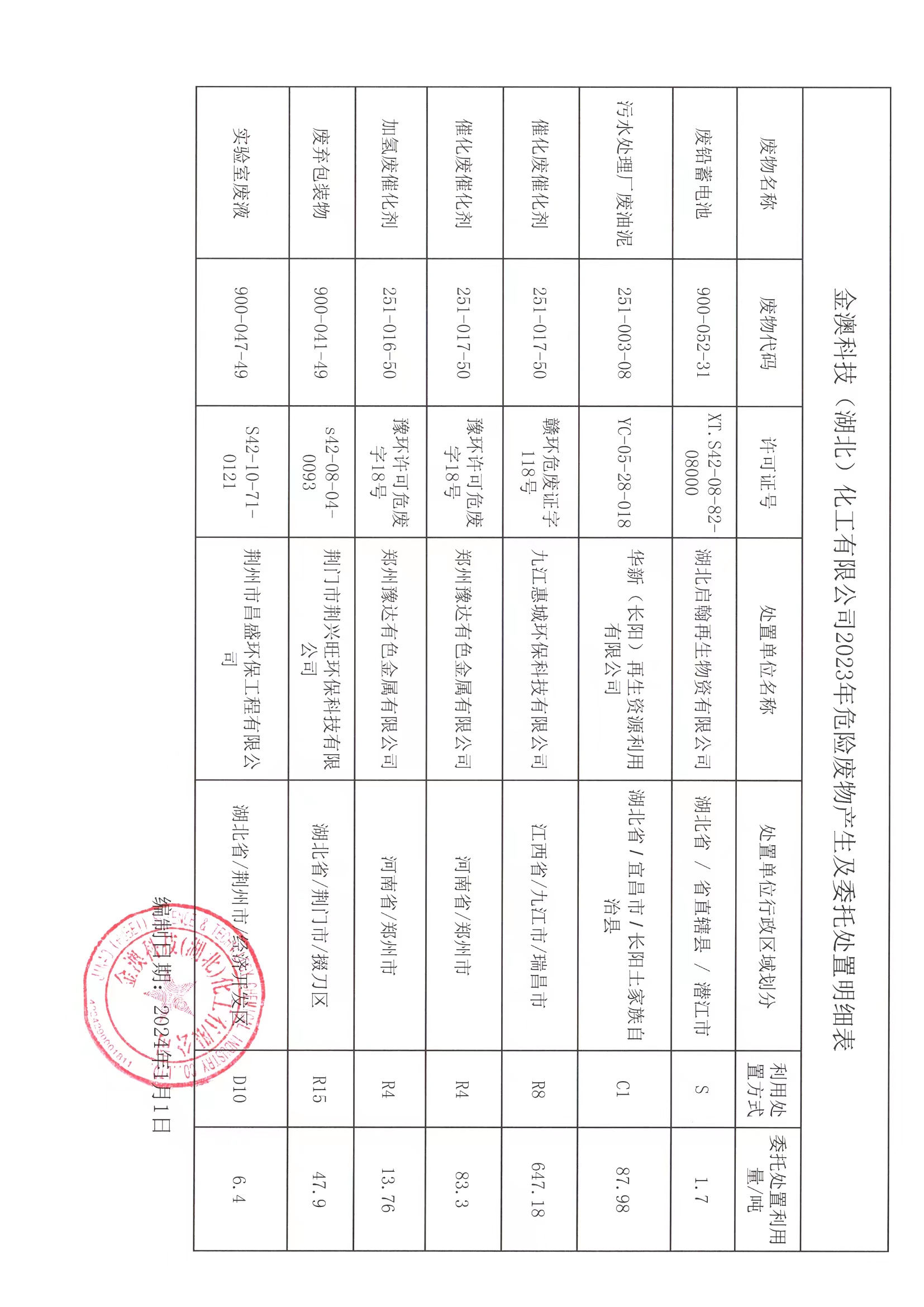 金澳科技(湖北)化工有限公司2023年危險(xiǎn)廢物產(chǎn)生及委托處置明細(xì)表